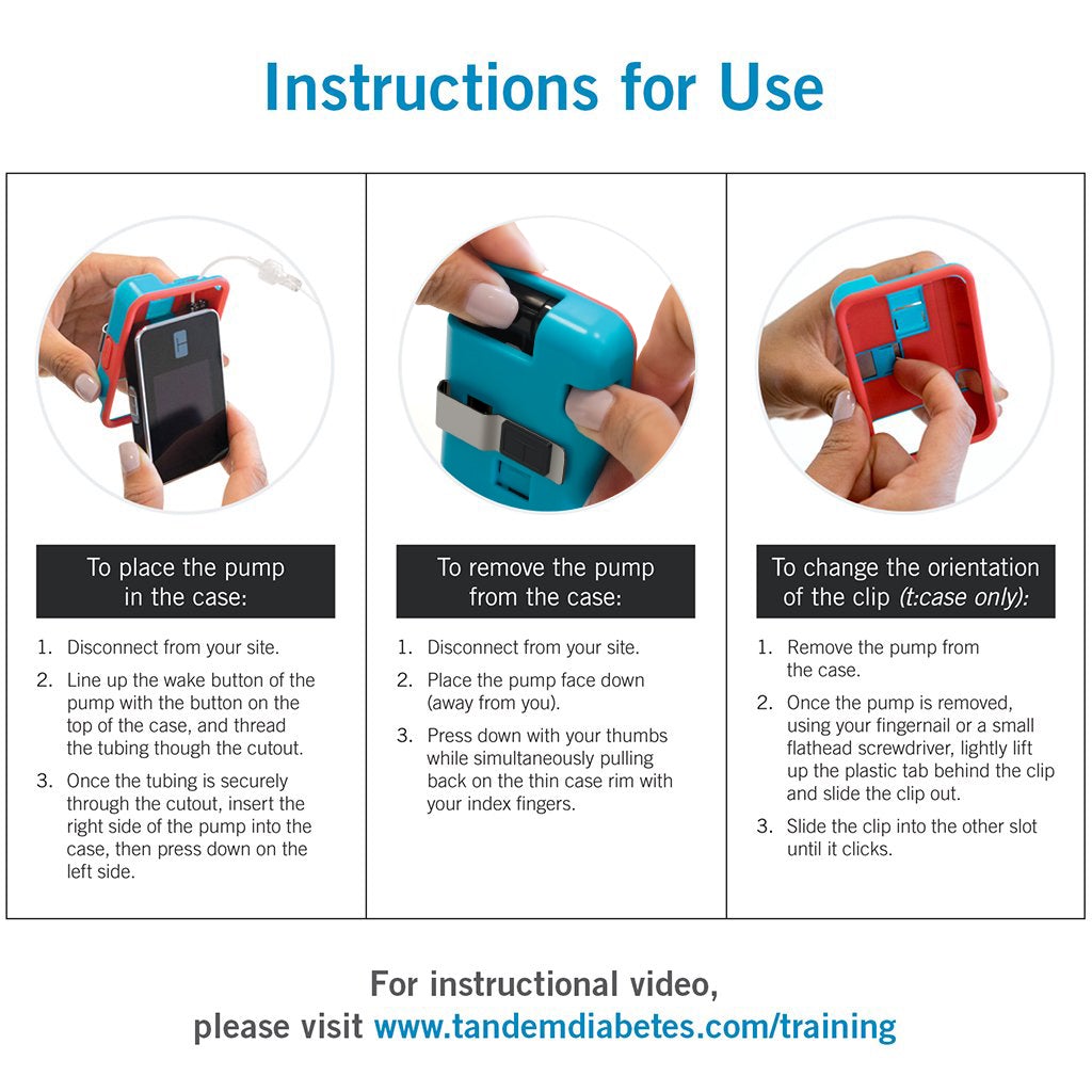 This t:case™ is a plastic case with a stainless steel clip that provides flexibility to wear the case vertically, horizontally or without a clip at all. The case was designed to allow you to perform all the day-to-day functions with your pump such as charging your pump, as well as changing your cartridge and tubing, without needing to remove the pump from the case.